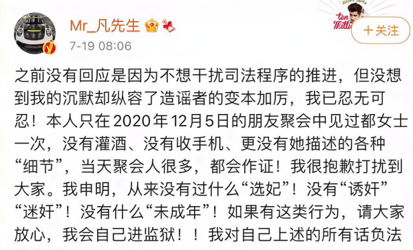 陷入舆论漩涡的吴亦凡7月19日上午在微博发文,否认都美竹此前爆料中的种种“细节”。吴亦凡工作室官微@Mr_吴亦凡工作室随后也发布声明,称都美竹编造与吴亦凡有关不实信息、蓄意煽动舆论、向工作室索要巨款,上述行为涉嫌违法犯罪,工作室已经向公安机关报案,案件被受理后正在依法侦办。