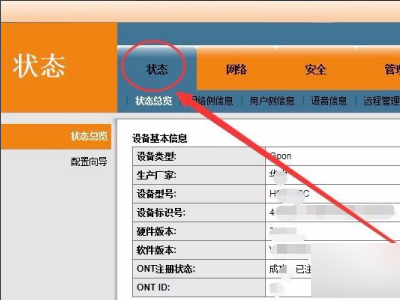 3、中国电信光纤猫界面中,选择状态选项卡。