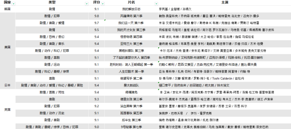 先上一下总表,总表按区域区分,区域电影按评分最高开始排,先上最新整理的图: