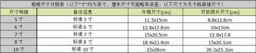 3、如果有特殊要求,也可以在洗照片的时候要求店家按照您给出的尺寸洗。下面给出一般相框和照片的常规尺寸,供参考: