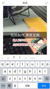 3.输入你要添加的文字内容,输入完成后点击视频画面中其他地方或者点击手机键盘中的“完成”。千万不要点击右上角的“√”。