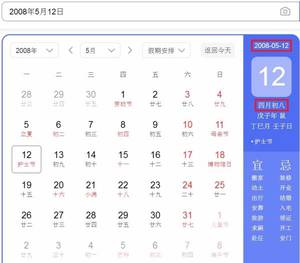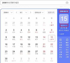 如图一,2008年农历5月12日,是阳历2008年6月15日。