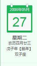 阳历2008年5月27日出生的,按农历来讲,生日是农历2008年四月二十三日
