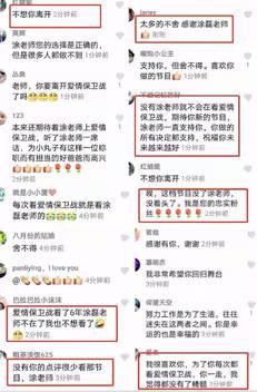 @粗茶淡饭:“没有你的点评很少看那节目,涂老师。”@红蜻蜓:“不想你离开,这档节目没有涂老师,没看头,我是你的忠实粉丝。”@封酒爷:“舍不得啊,爱情保卫战没了你,少了灵魂。”不舍得涂磊离开舞台的人很多,但是阻挡不了他回归家庭的脚步。