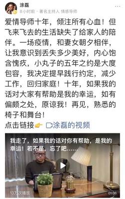 2020年四月份,涂磊在微博突然发文宣布离开《爱情保卫战》舞台,他说:“爱情导师十年,倾注所有心血!十年,如果我的话对大家有帮助是我的幸运,如有偏颇之处,原谅我”,可以看出他对这份工作的情感和不舍。