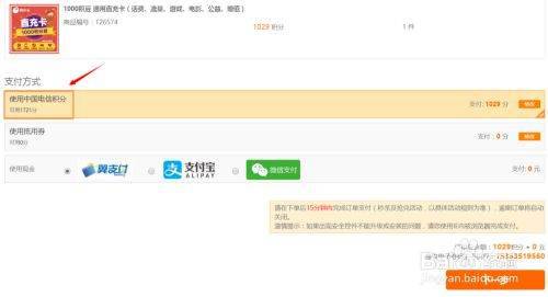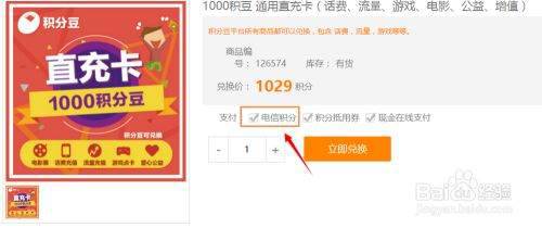选择了相应兑换的产品以后,务必要勾选"电信积分"选项,如下图;兑换成功以后系统会给我们的手机发送一条短信,上面是一个卡号,也就是兑换码
