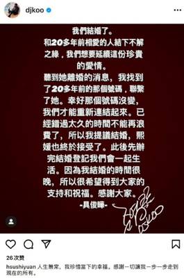 韩团“酷龙”成员具俊晔宣布与45岁的大S再婚,具俊晔是在个人社交账号发布长文宣布的,具俊晔长文内容如下:听到他离婚的消息,我找到了20多年前的那个号码,联系上了她。万幸那个号码没变,才让我们重新联系上了,已经错过太久的时间不能再浪费了,所以我提议结婚,熙媛也终于接受了。