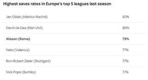 (图)上赛季的五大联赛的所有门将中,阿利松的扑救成功率能够排在第三位,仅次于奥布拉克和德赫亚