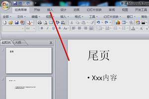 2、然后进入到最后一张幻灯片中,再点击菜单中的“插入”选项。