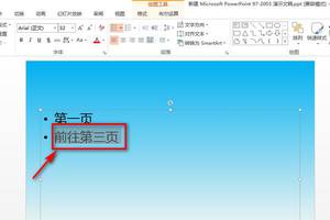 1、打开一个制作好的PPT,选中“前往第三页”,如下图所示;