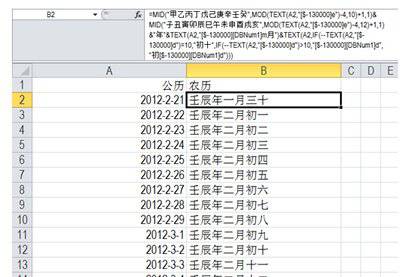 3.假如把公式改成:=MID("甲乙丙丁戊己庚辛壬癸",MOD(TEXT(A2,"[$-130000]e")-4,10)+1,1)&MID("子丑寅卯辰巳午未申酉戌亥",MOD(TEXT(A2,"[$-130000]e")-4,12)+1,1)&"年"&TEXT(A2,"[$-130000][DBNum1]m月")&TEXT(A2,IF(--TEXT(A2,"[$-130000]d")=10,"初十",IF(--TEXT(A2,"[$-130000]d")>10,"[$-130000][DBNum1]d","初[$-130000][DBNum1]d"))),那就更像农历表示法了,不过因为农历每年开始日期都不一样,所以函数很难达到十分精确的结果,只能是将就着用。