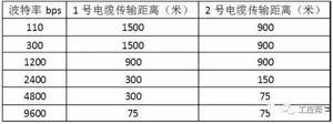 由RS-232C标准规定在码元畸变小于4%的情况下,传输电缆长度应为50 英尺,其实这个4%的码元畸变是很保守的,在实际应用中,约有99%的用户是按码元畸变10-20%的范围工作的,所以实际使用中最大距离会远超过50英尺,美国DEC公司曾规定允许码元畸变为10%而得出下面实验结果。其中1 号电缆为屏蔽电缆,型号为DECP.NO.9107723 内有三对双绞线,每对由22# AWG 组成,其外覆以屏蔽网。2 号电缆为不带屏蔽的电缆。型号为DECP.NO.9105856-04是22#AWG 的四芯电缆。