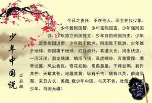 故今日之责任,不在他人,而全在我少年。少年智则国智,少年富则国富;少年强则国强,少年独立则国独立;少年自由则国自由;少年进步则国进步;少年胜于欧洲,则国胜于欧洲;少年雄于地球,则国雄于地球。