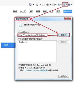 2、若百度网盘用户使用的是较高版本的浏览器,可手动开启兼容性视图选项,或打开兼容性视图设置,用户自己手动把把百度网盘主页网址“添加”进“已添加到兼容性中的网站”里面。