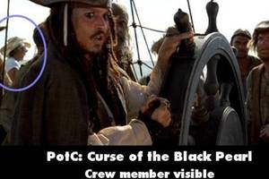 《加勒比海盗1:黑珍珠号的诅咒》,约翰尼德普在现场走来走去,发号施令。有一次,他要求工作人员指派——名工作人员到现场,站在他身后取景框的角落里。你可以清楚地看到,不是机组成员的人无意走过——。这个人戴着一顶不合时宜的牛仔帽和一件短袖白t恤。有时候很难回去化妆,尤其是在有很多角色和不同服装的故事片里。然而,这似乎只是一个偶然走到现场而没有被注意到的人。