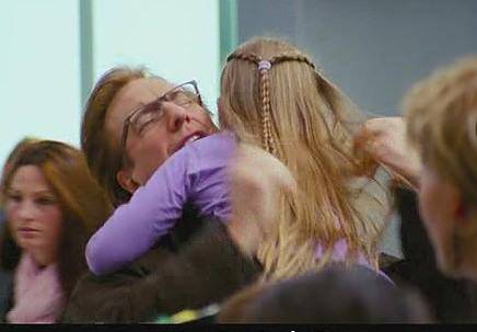 《真爱至上》有一幕。是紫衣服小女孩向他扑来~没戴帽额。。不知道是不是你看的。