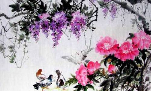译文:桃红柳绿的春山,煦暖的阳光照耀,和柔的东风吹拂,楼阁上高卷起帘拢,倚栏干远望。杨柳垂条,秋千轻晃,院子里静悄悄。院外黄莺啼鸣,春燕飞舞; 小桥之下流水飘满落红。