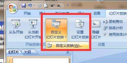 2、之后在幻灯片放映下面的工具栏中点击“自定义幻灯片放映”,接着再继续点击“自定义放映”。