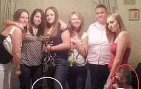 图片中的两个孩子的母亲抱着自己的孩子在餐厅中拍照。但是突然出现了一个倒挂的人影。在餐厅白色蜡烛的照应下显得十分的恐怖。完全不知道这个倒挂的人影到底是人还是鬼。而且图片中的母亲有着诡异的笑容。