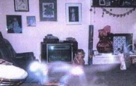 这是在客厅中,一个小女孩在自己玩耍。但是小女孩前面的那些白色的物体是什么?这十分像传说中人的鬼魂。而且这鬼魂还是跪着的。不过这个小女孩是完全不知道这个危险的情况的。