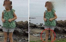 这是一张小女孩在海边拍照的图片,本来是十分正产的,但是仔细的观察你会发现女孩的后面还有一双腿,这双腿穿着的是黑色的皮靴,而且你只可以看见皮靴,完全看不到其它的部位。