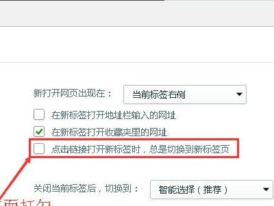 4、在跳转的界面中,找到“点击链接打开新标签时,总是切换到新标签页”,并勾选即可。