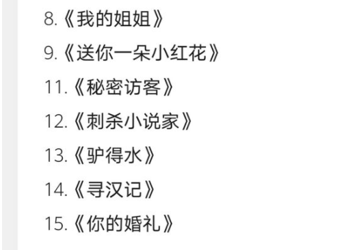 《霸王别姬》《荆轲刺秦王》《秋菊打官司》《人潮汹涌》《烟火人间》《刺杀小说家》《你的婚礼》《风再起时》《唐人街探案3》《吉祥如意》《涉过愤怒的海》。