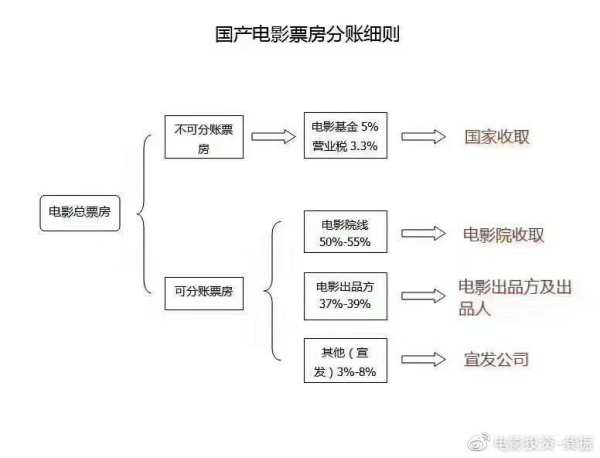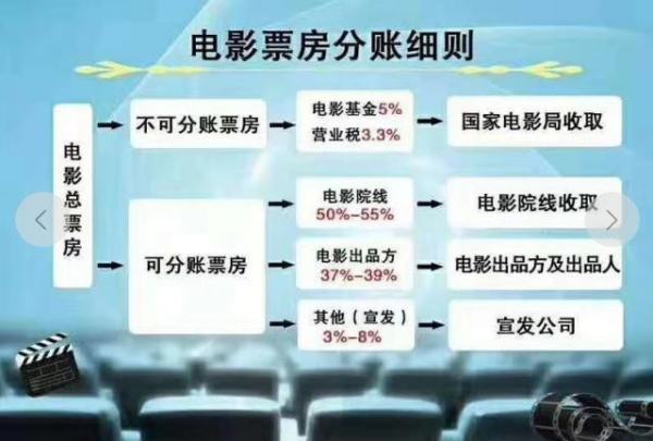 电影票房,分成如下:电影发展基金5%,营业税3.3%;院线50-60%;其余为制作商和发行商。