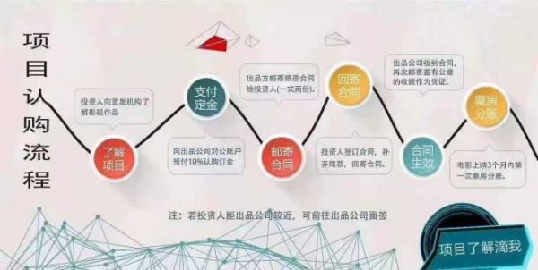 选择想投资的电影→了解项目资料与合同→确定认购金额→打款到出品公司对公账户→签订合同→等待电影上映→电影上映后等分红→会计律师所计算好分红→打款到合同上的银行卡上。