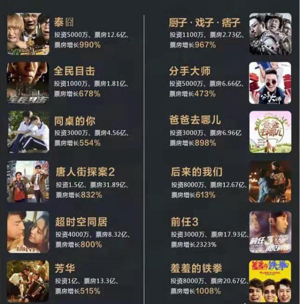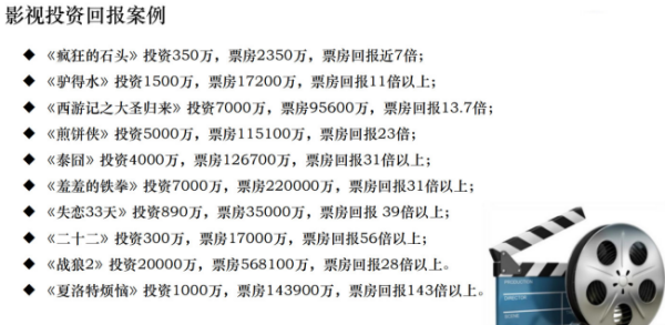 影片票房火爆的背后,当然是投资方大赚特赚。比如说一部成本3000万的影片,最终票房达到12.69亿,这部影片就是当时很受欢迎的《泰囧》,影片背后的投资方有一位90后,于宇昂投《泰囧》400万,经票片分账获得的收益为7000万;成本为5亿的《红海行动》,四川人投资百分之十,也就是5000万,最终吸金1.2个亿……