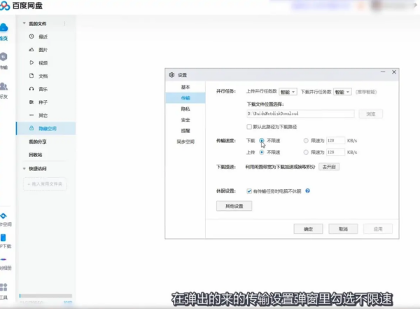 3.解除限速 在传输速度后面勾选不限速后,点击确定即可解除。