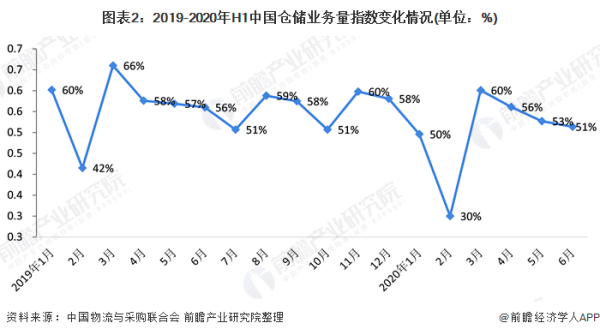 2020年受新冠疫情影响,1-6月仓储业平均业务量指数为49.98%,略低于荣枯线水平50%,在上半年全国经济明显收缩的背景下,仓储业务需求表现稳定,预计疫情完全恢复后将呈现上升趋势。