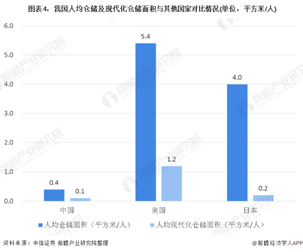 根据中信证券资料,中国目前人均仓储面积为0.4平方米/人,远远低于日本的4.0平方米/人和美国的5.4平方米/人;人均现代化仓储(高标仓)面积占比仅仅0.1平方米/人,而美国人均却高达1.2平方米/人。显示出国内高标仓供给量不足,还有很大的市场拓展空间。
