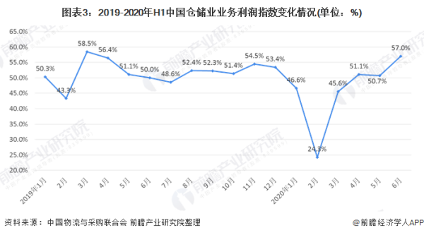 2019年全年中国仓储业务利润指数均值为51.9%,同比增加3.1个百分比,反映出仓储企业盈利能力有所提升。2020年初受到疫情影响,在2020年2月份降到历史最低的24.3%,2020年上半年平均业务量指数为45.9%,保持在荣枯线以下,但疫情稳定后的4月份开始恢复到荣枯线以上水平,说明仓储业务利润仍有进一步扩展趋势。