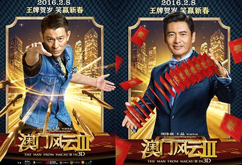 王晶导演的《澳门风云3》在大年初一贺岁上映,以1.78亿的当日票房成绩排在同同档期上映影片的第二名,超过之前被寄予厚望的《西游记之三打白骨精》的1.7亿的票房成绩。排在第一名的是周星驰的《美人鱼》,大年初一当天的票房成绩是2.76亿。