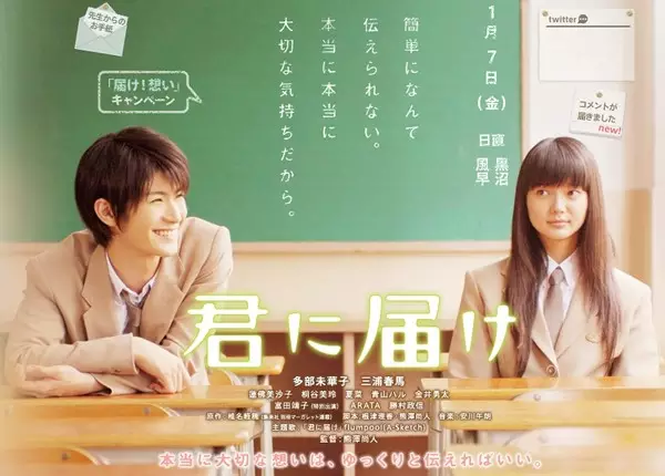 这部影片改编自日本漫画家椎名轻穗原作漫画《好想告诉你》改编,由熊泽尚人执导,多部未华子和三浦春马主演。作品是关于友情和爱情的成长故事,描写外表阴暗,被周围的人称作“贞子”的女高中生黑沼爽子通过自我努力逐渐消除身边的人对她的误解,在遇到清爽少年风早之后,慢慢地融入班级,慢慢成长的校园爱情故事。