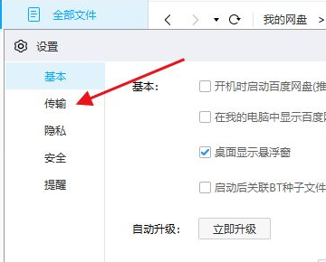 3、然后在设置中点击左侧的传输,如下图所示。