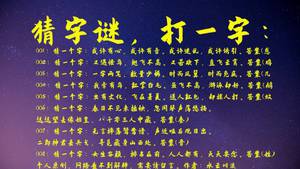 1、鲁迅逝世一世纪。(打一成语)谜底:百年树人 2、建国方略。(打一字) 谜底:玉 3、七仙女嫁出去一个。(打一成语) 谜底:六神无主 4、拍一个巴掌。(打一地名) 谜底:五指山 5、什么动物行也是坐,坐也是坐,睡也是坐? 谜底 青蛙 6、石头旁边有块皮。(打一字) 谜底:破 7、力主议和(打一战争):阻击战 8、羽(打一常用语):复习 9、无尺土之封(打字一):一 10、尾生死前犹念伊(打字一):一 11、为数虽少,却在百万之上(打字一):一 12、东郊远树看如画(打字一):邦 13、泪(打一成语):颠三倒四 14、羽(打一成语):出言不逊 15、弃女(成语一):一掷千金 16、马虎(成语一关于南北的四字词语