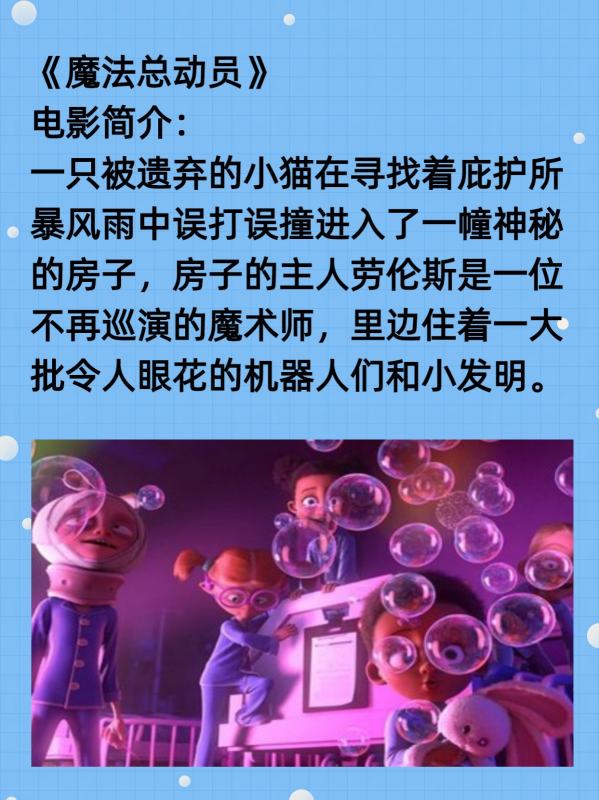 《魔法总动员》是比利时2013年出品的动画电影,影片讲述了一只被遗弃的小猫误打误撞进入一幢神秘的别墅,并在保卫家园的过程中共同成长的欢乐故事有啥好看的,新出的电影?推荐一下吧!