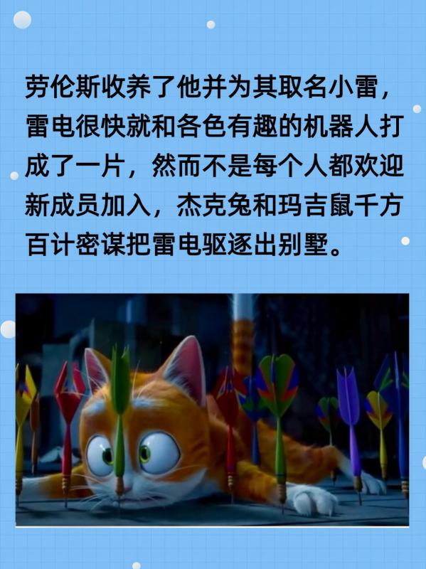 劳伦斯收养了他并为其取名小雷,雷电很快就和各色有趣的机器人打成了一片,然而不是每个人都欢迎新成员加入,杰克兔和玛吉鼠千方百计密谋把雷电驱逐出别墅。