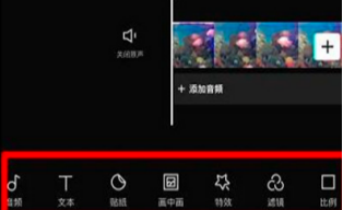 4、导入视频之后就可以进行剪辑了,利用下方音频、文本、贴纸以及滤镜等功能编辑成自己满意的样子。对视频进行剪辑,添加文本,画中画等特效。