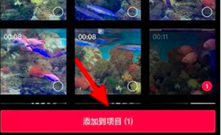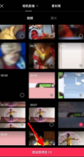 3、找到相机胶卷功能,然后选择要导入的视频素材。点击素材库。勾选需要的素材,导入,组合。