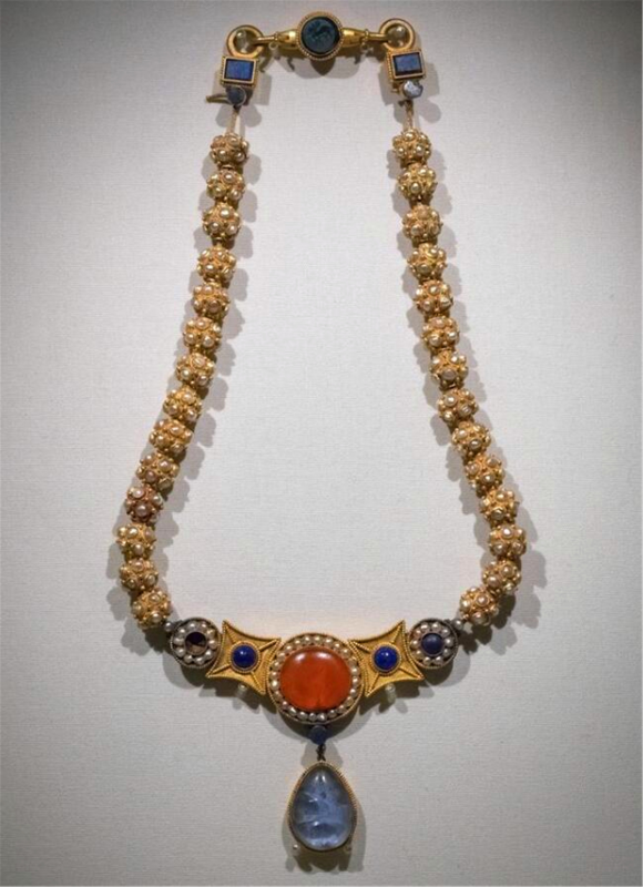 这条金项链由28个嵌了珍珠的金球所组成,链接的链子都是用金丝所编织的,上面还有珍珠、鸡血石、青金石垂饰,别有一番风情,即便放在现代,也毫不过时,因此在网上还有仿制品。而真正的李静训金项链,正陈列在博物馆里,使得更多的人,感受到了它背后的故事。这条金项链,应该正是李静训外祖母给她的。可见杨丽华简直不能再疼爱这个外孙女,恨不能把最好的给她。