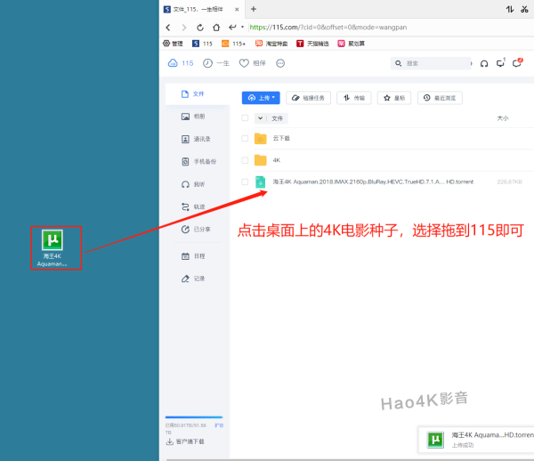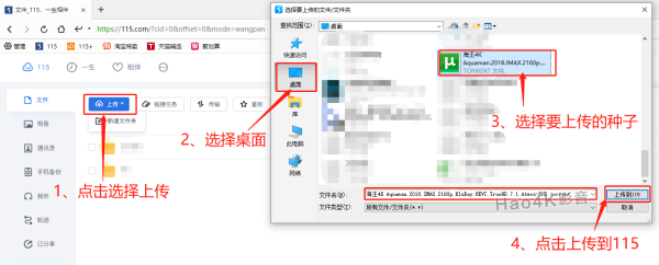 方法二:也可以打开115,选择点击上传,选择下载到本地的种子,点击上传到115。