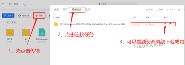 10:点击传输、再点击链接任务可以看到4K电影是否离线成功(这个过程一般不到1分钟可以离线下载完成)