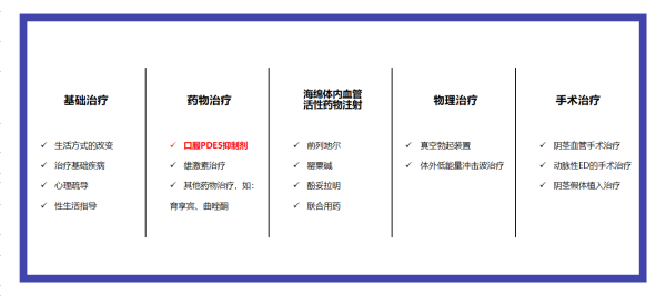 目前阳痿的治疗方法主要有基础治疗、药物治疗、手术治疗、物理治疗、海绵体内活性药物血管注射这五种方法,如下图所示:
