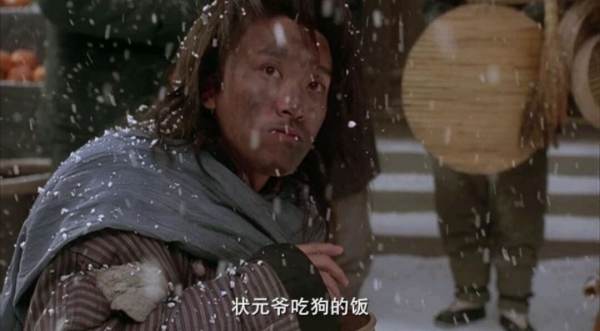 可以说是把星爷的落魄描绘的淋漓尽致了。一个武状元,捡人家的狗饭吃,再配上漫天的大雪,从一个官宦子弟,沦落为一个卑贱的乞丐,受尽各种欺辱,处境是相当的悲凉。