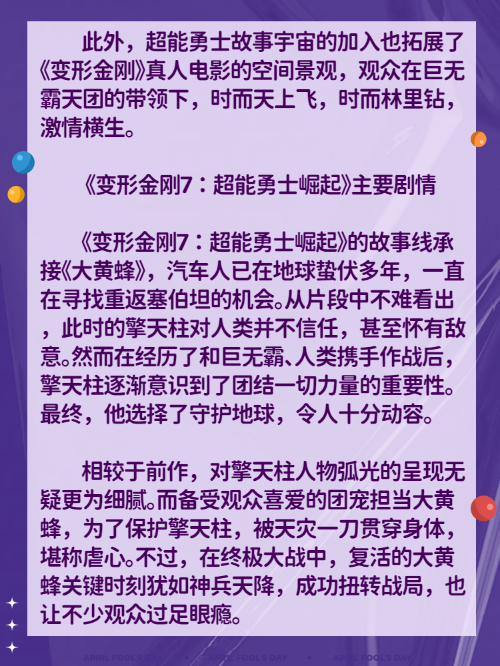 《变形金刚7:超能勇士崛起》是一部很好看的电影,剧情内容真正回归到了变形金刚本身。
