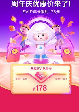 原价要298的超级会员现价只要178即可成为超级会员,折算下来,每天仅需不到0.5元,即可实现网盘超级会员自由!(一年内最低价)