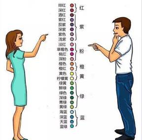 甚至之前还有一张图,清晰的表明了颜色在男性和女性眼中的差异,女人看颜色的时候可以看出n种,但是男孩子总能把它们归结成一种。还有更可怕的数据统计,在12个男性中就有一个是患有色盲的。要知道我们常人之所以能看出那么多那么多种颜色,是因为三种视锥细胞组合起来,可以无限的重组,大约可以区分100万种不同的颜色,但是患有色盲的人仅仅只有两种正常运作的水细胞,所以他们看出来的颜色也是比较单一。
